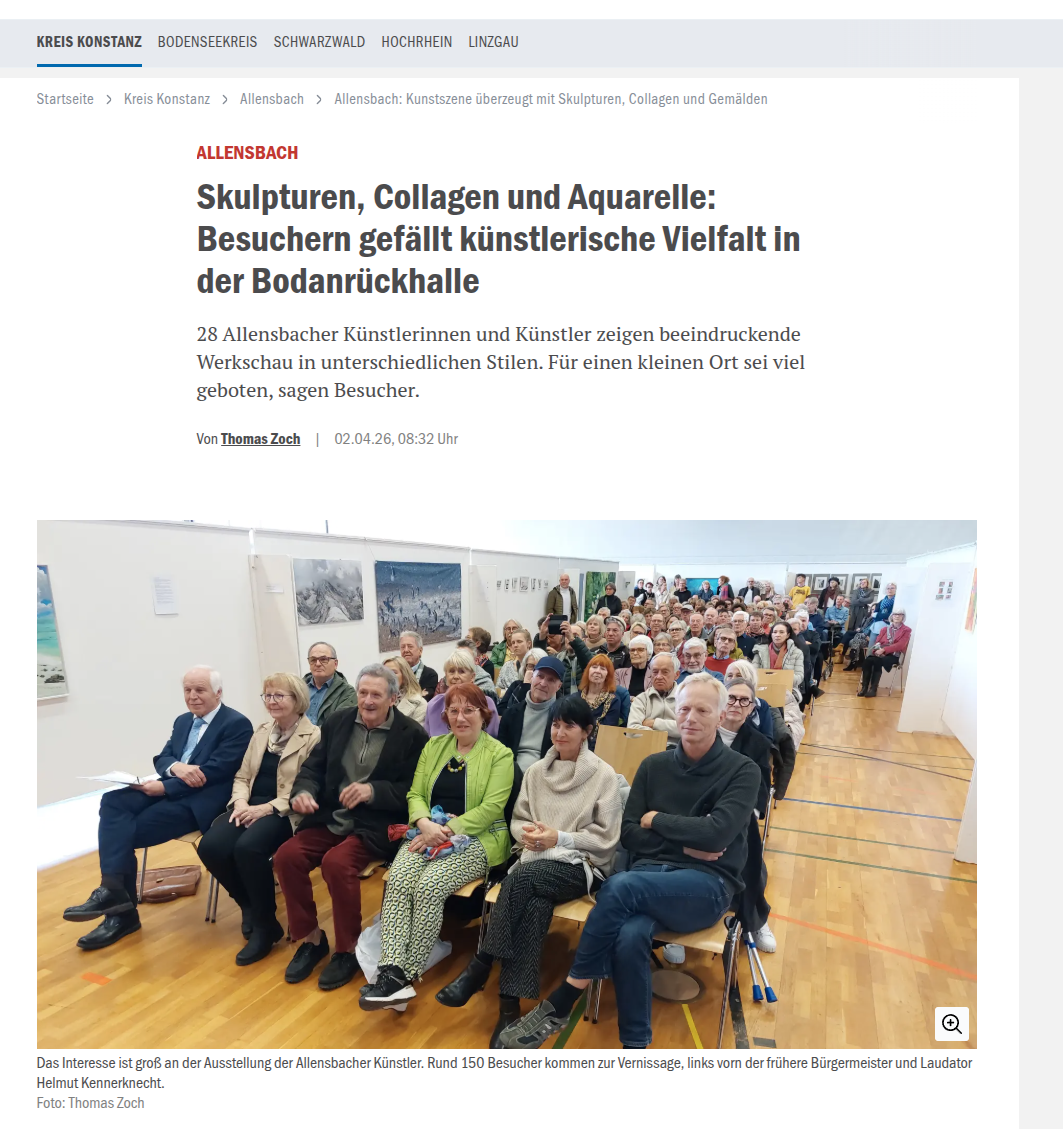 In den Osterferien wird die Bodanrückhalle wieder zu einer großen Galerie. Denn die Gruppe der Allensbacher Künstler zeigt dort vom 31. März bis zum 8. April ihre große und vielseitige Frühjahrsausstellung. Öffnungszeiten sind werktags von 14 bis 18 Uhr, an den Feiertagen von 10 bis 18 Uhr. 28 Frauen und Männer aus der Gemeinde sind diesmal mit rund… Artikel im Südkurier weiterlesen - Es sind alle Bewohner der Gemeinde Allensbach angesprochen, die sich jedweder Art von Kunst widmen, egal ob Malerei, Textil, Digital-Art, Keramik, Holz, Stein, Schrift oder Installation.Exhibition No. 39 fiebert der 40 entgegen. Das klingt nach einer fantastischen Vorstellung für das kommende Jahr! Um ganz präzise zu sein: Da das 40. Jubiläum der Allensbacher Künstler erst für das nächste Jahr angekündigt ist, handelt es sich bei dem Termin vom 31. März bis zum 8. April 2026 in der Bodanrückhalle um die Exhibition… Es sind alle Bewohner der Gemeinde Allensbach angesprochen, die sich jedweder Art von Kunst widmen, egal ob Malerei, Textil, Digital-Art, Keramik, Holz, Stein, Schrift oder Installation. weiterlesen